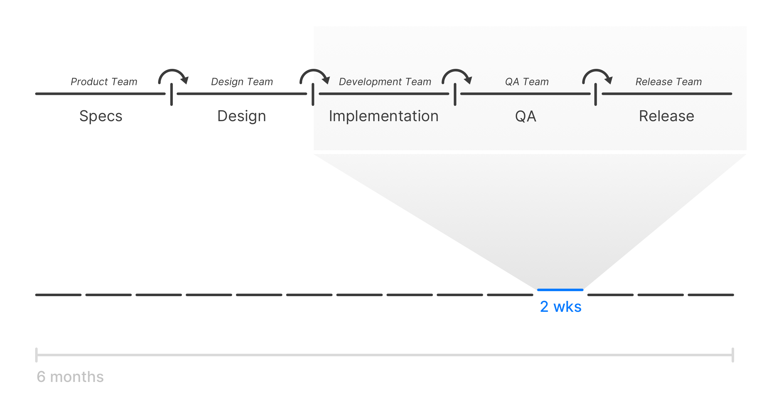 However, the actual workflow within the sprints is still essentially an assembly line — often with deliverables thrown from one specialized team to another “over the fence”. While at Ford’s production factory floor the assembly line work was encapsulated purely within the manufacturing (“implementation”) stage of the production process—efficiently producing the same product over and over again for years, the complexity of modern technological innovation work calls for what Agile approach is truly about. It’s not so much about scheduling the work in 1–4-week chunks (which, of course, does give the desired flexibility to the business), as much it is about making the right decisions based on the data gathered and contributed—essentially doing the right work—collaboratively.